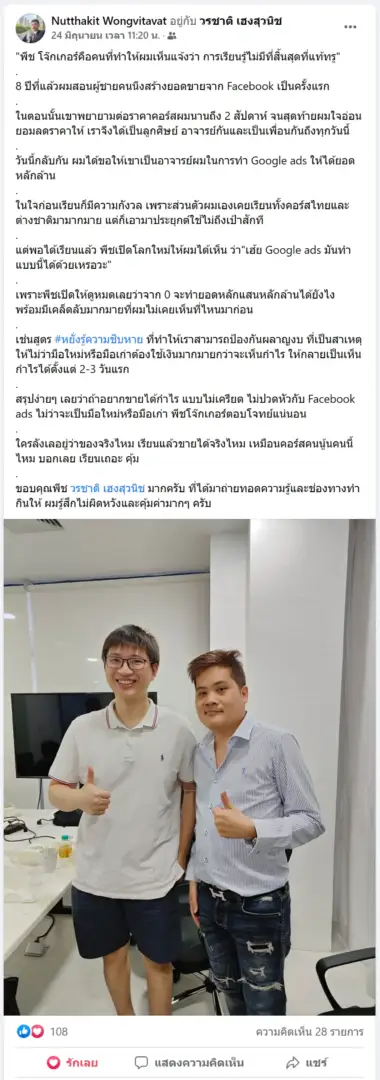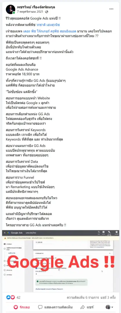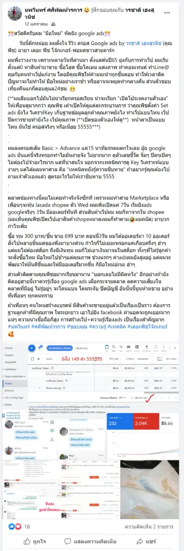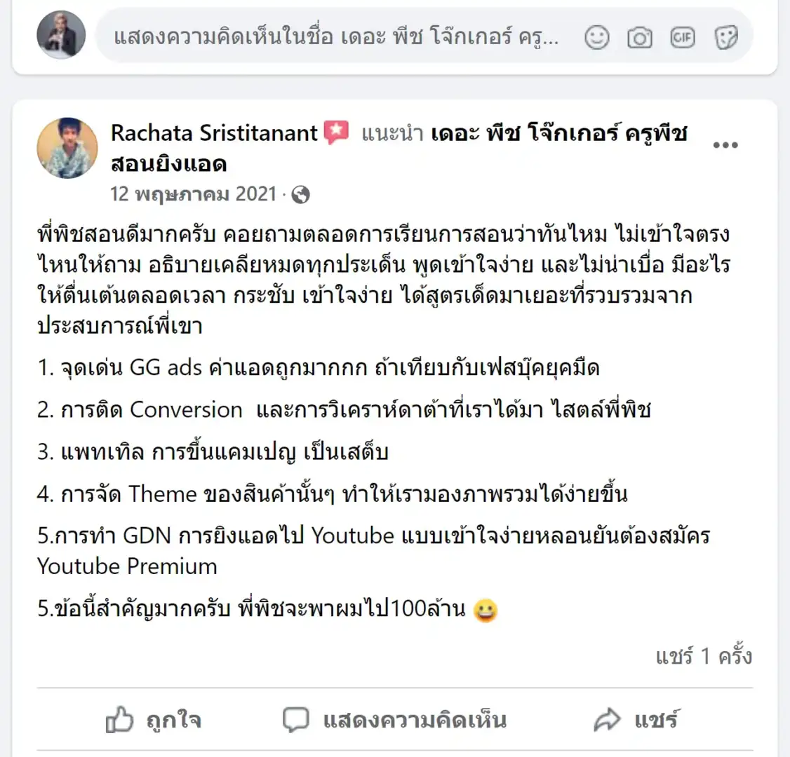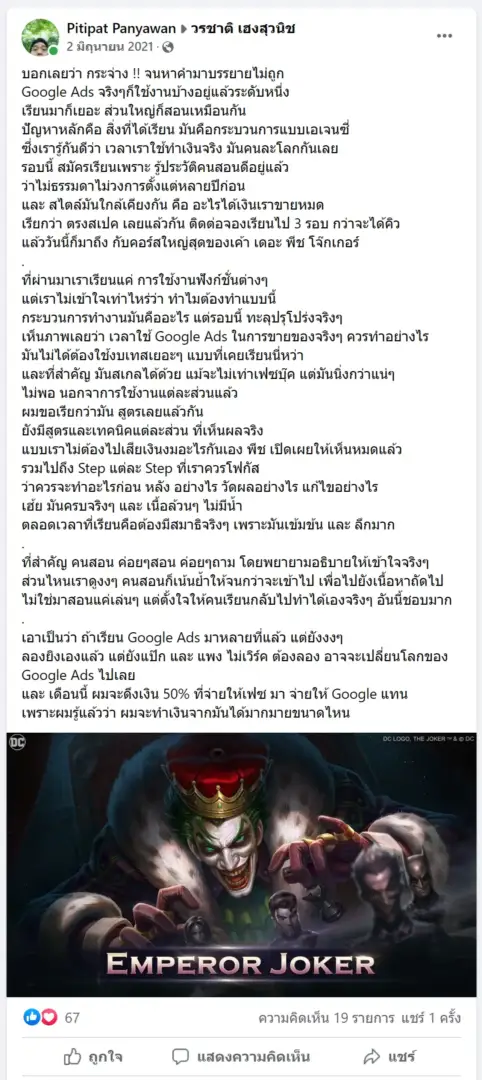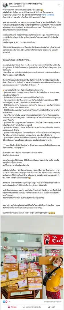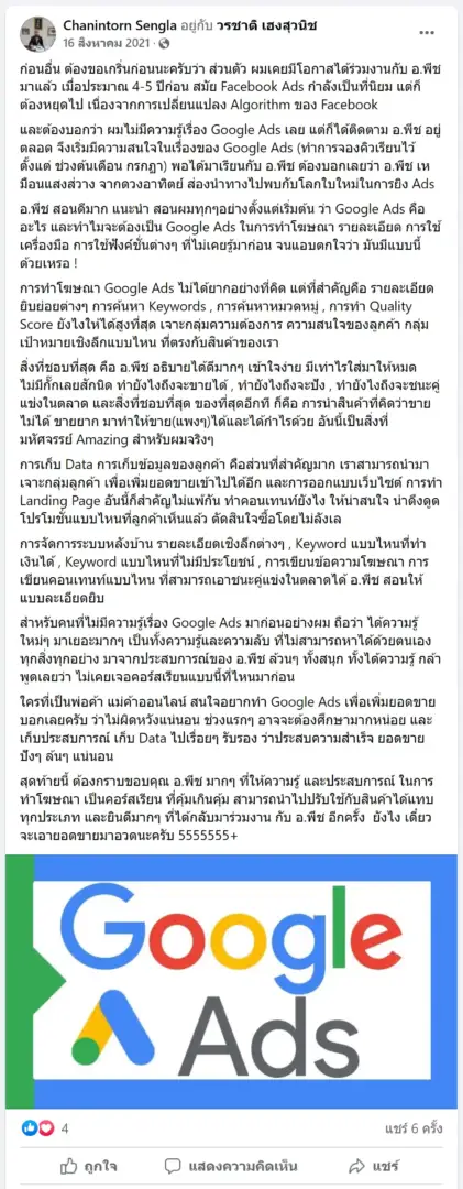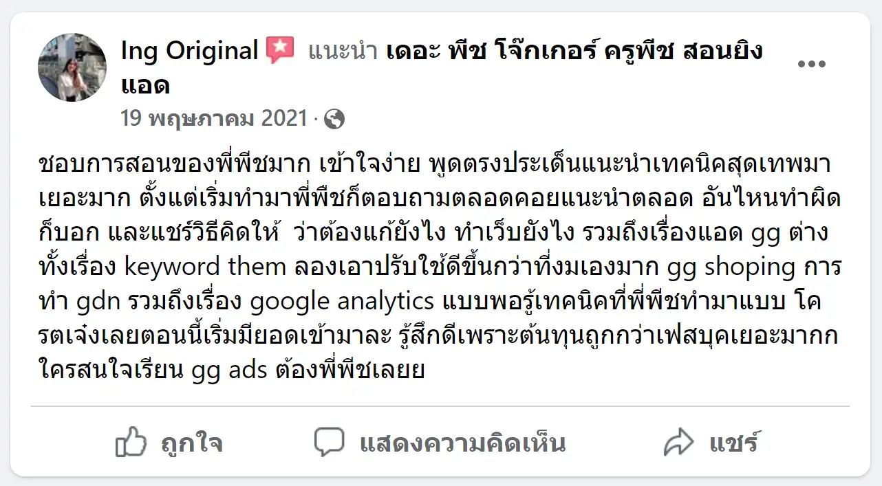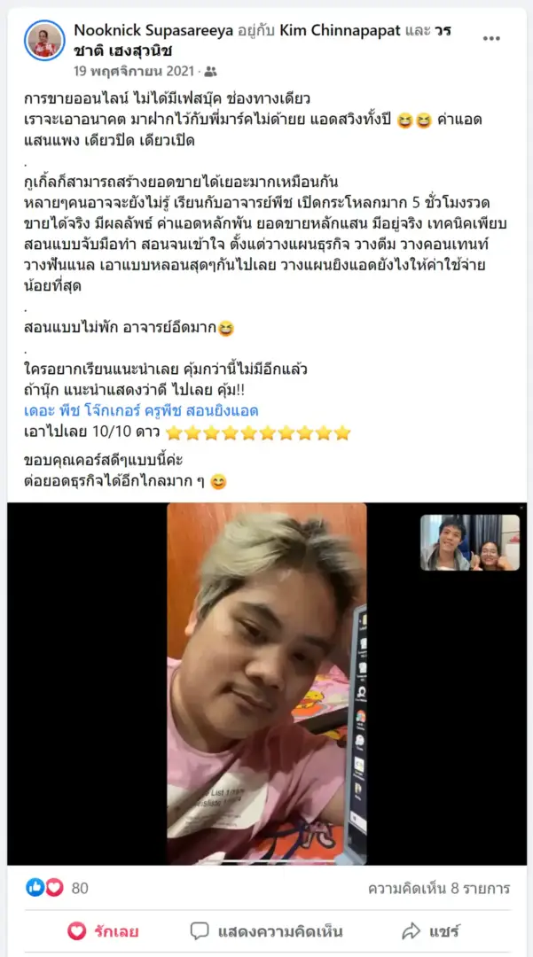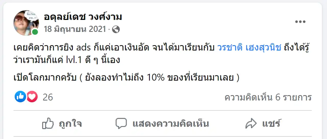 คราวนี้ไม่ใช่แค่การขายของ แต่ผมอยากสอนและถ่ายทอดประสบการณ์ให้พ่อค้าแม่ค้าออนไลน์รู้จักการยิงแอดโฆษณา หลักสูตรของผมจึงค่อย ๆ ก่อร่างสร้างตัวจากประสบการณ์จริง ใส่เทคนิค วิธีต่าง ๆ ที่เคยผ่านมาเพื่อให้การทำแอดโฆษณา เกิดผลลัพธ์อันน่าพึงพอใจ ผมอาจไม่ใช่คนที่เก่งที่สุดในด้านนี้ แต่ผมเชื่อว่าสิ่งที่ผมตั้งใจถ่ายทอดออกไปบวกกับทุกคนมีความพยายาม และเมื่อนำเอาหลักสูตรของผมไปปรับใช้ โอกาสแห่งความสำเร็จจะเกิดขึ้นอย่างแน่นอน