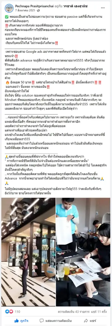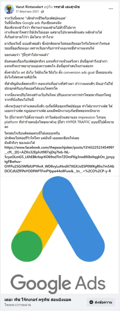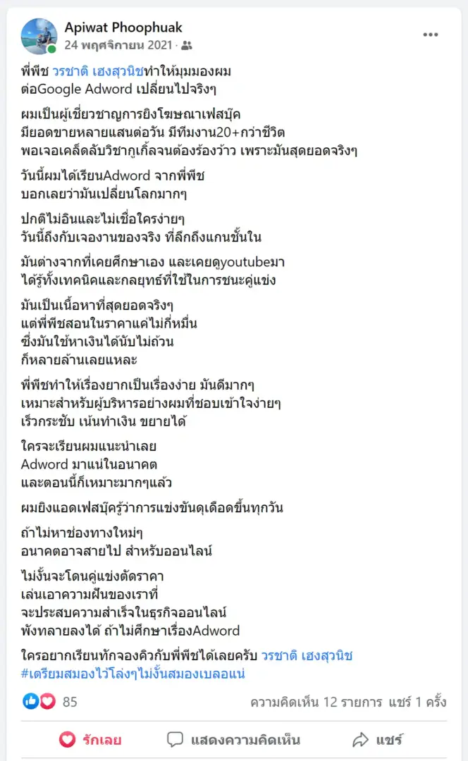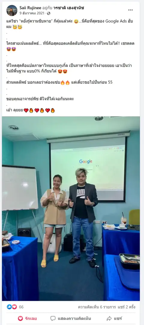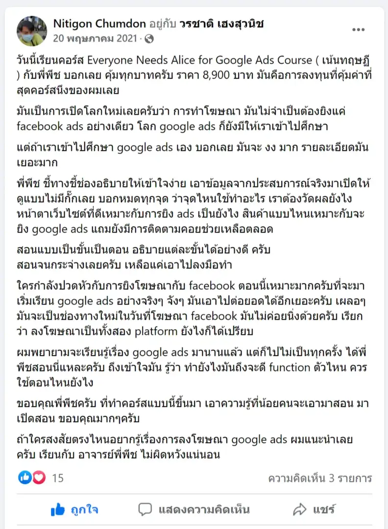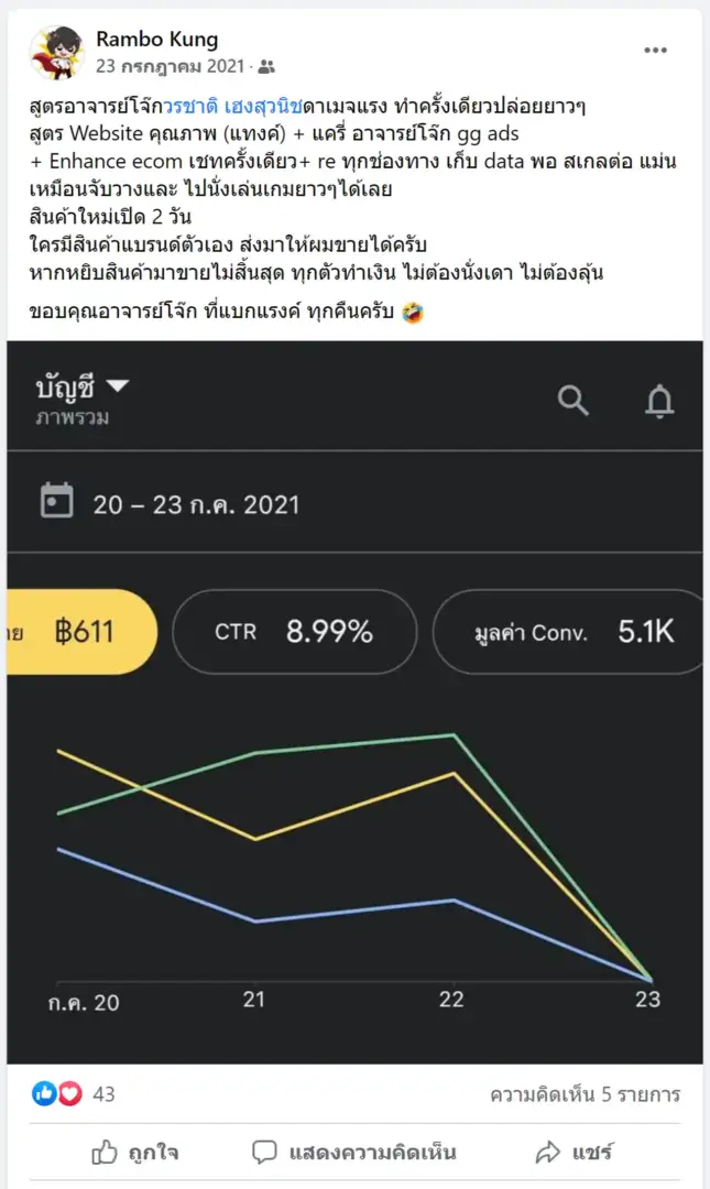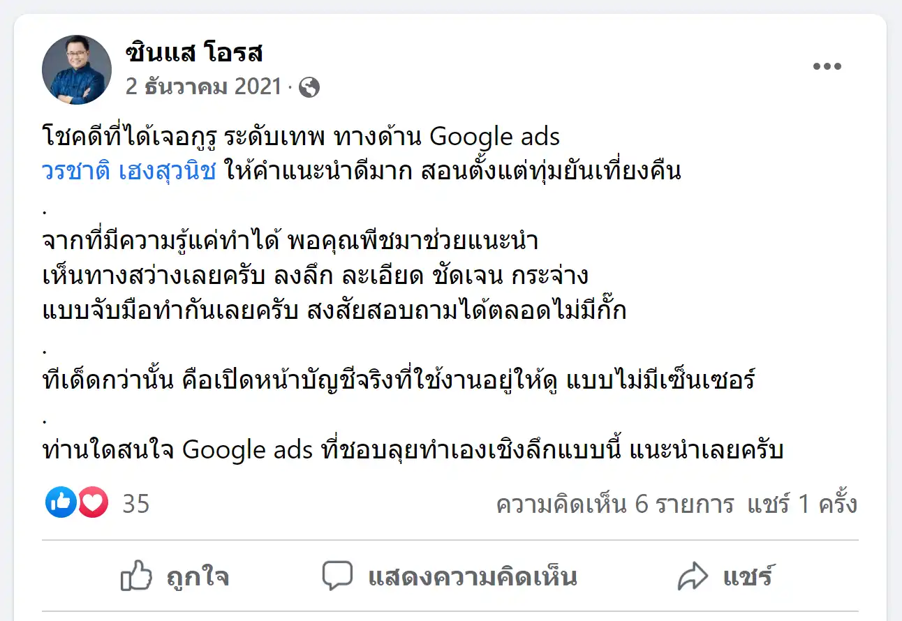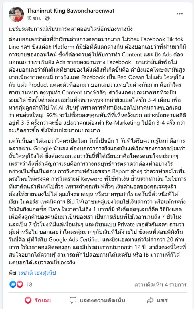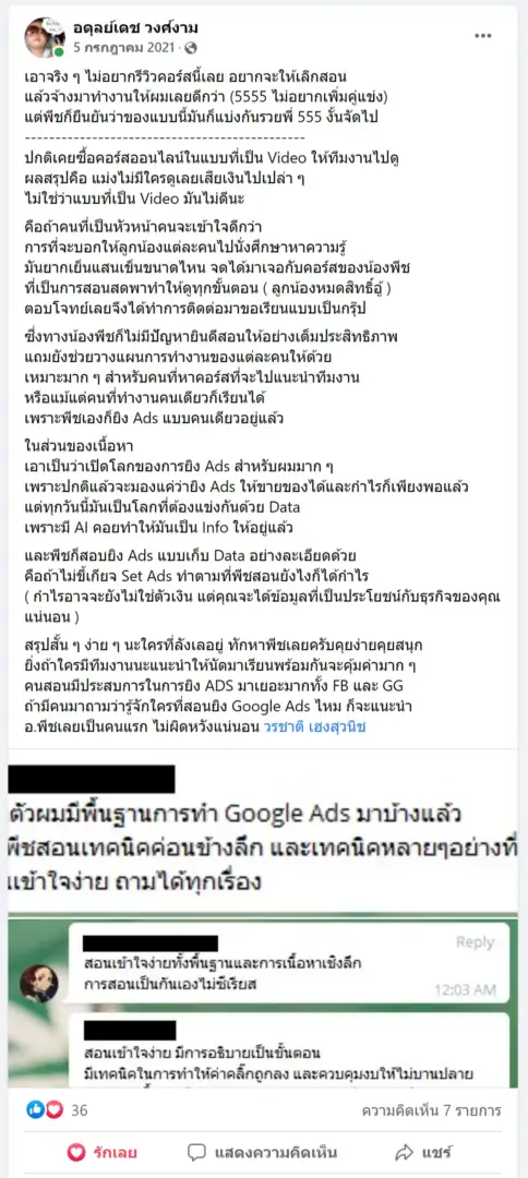 คราวนี้ไม่ใช่แค่การขายของ แต่ผมอยากสอนและถ่ายทอดประสบการณ์ให้พ่อค้าแม่ค้าออนไลน์รู้จักการยิงแอดโฆษณา หลักสูตรของผมจึงค่อย ๆ ก่อร่างสร้างตัวจากประสบการณ์จริง ใส่เทคนิค วิธีต่าง ๆ ที่เคยผ่านมาเพื่อให้การทำแอดโฆษณา เกิดผลลัพธ์อันน่าพึงพอใจ ผมอาจไม่ใช่คนที่เก่งที่สุดในด้านนี้ แต่ผมเชื่อว่าสิ่งที่ผมตั้งใจถ่ายทอดออกไปบวกกับทุกคนมีความพยายาม และเมื่อนำเอาหลักสูตรของผมไปปรับใช้ โอกาสแห่งความสำเร็จจะเกิดขึ้นอย่างแน่นอน
