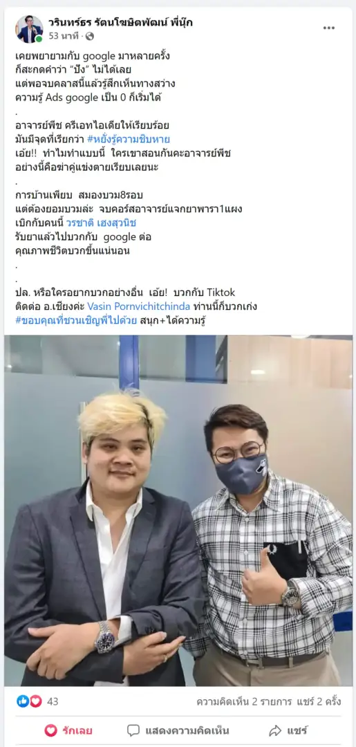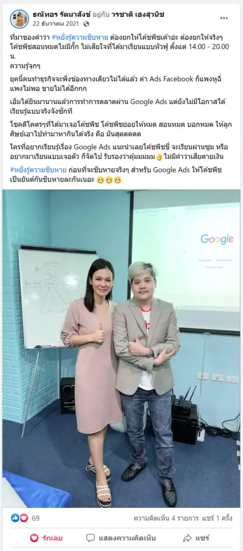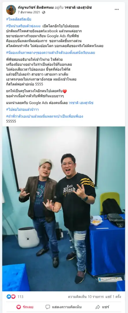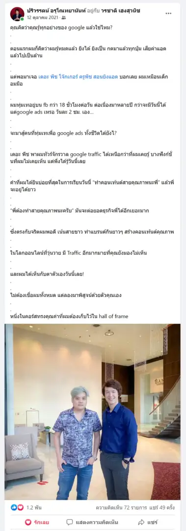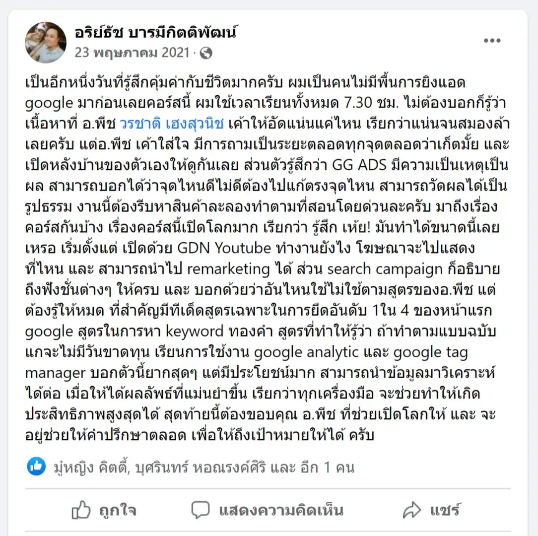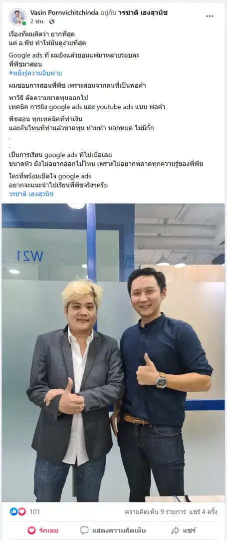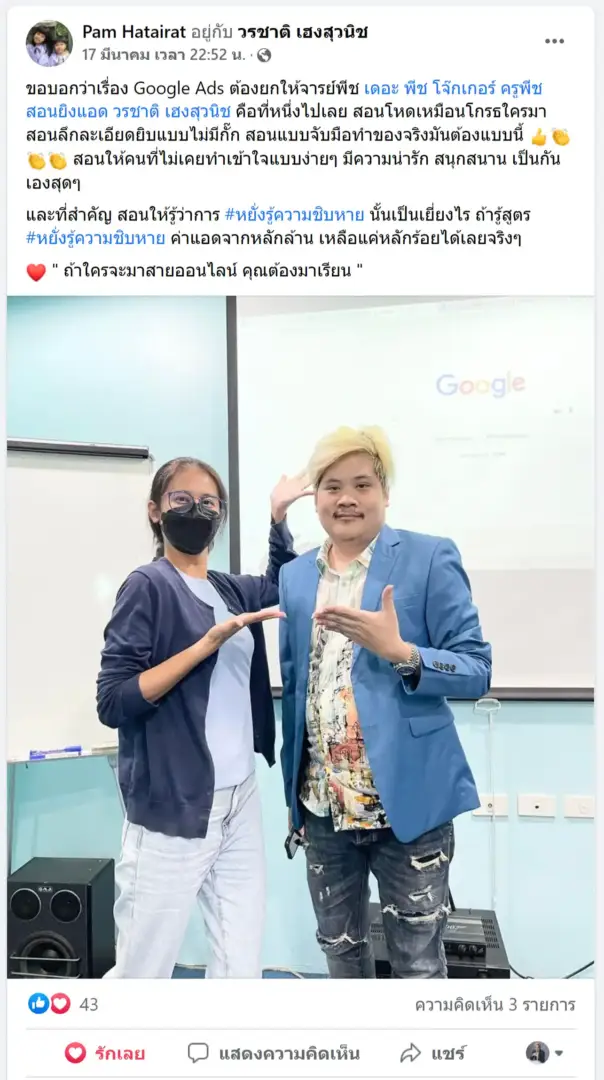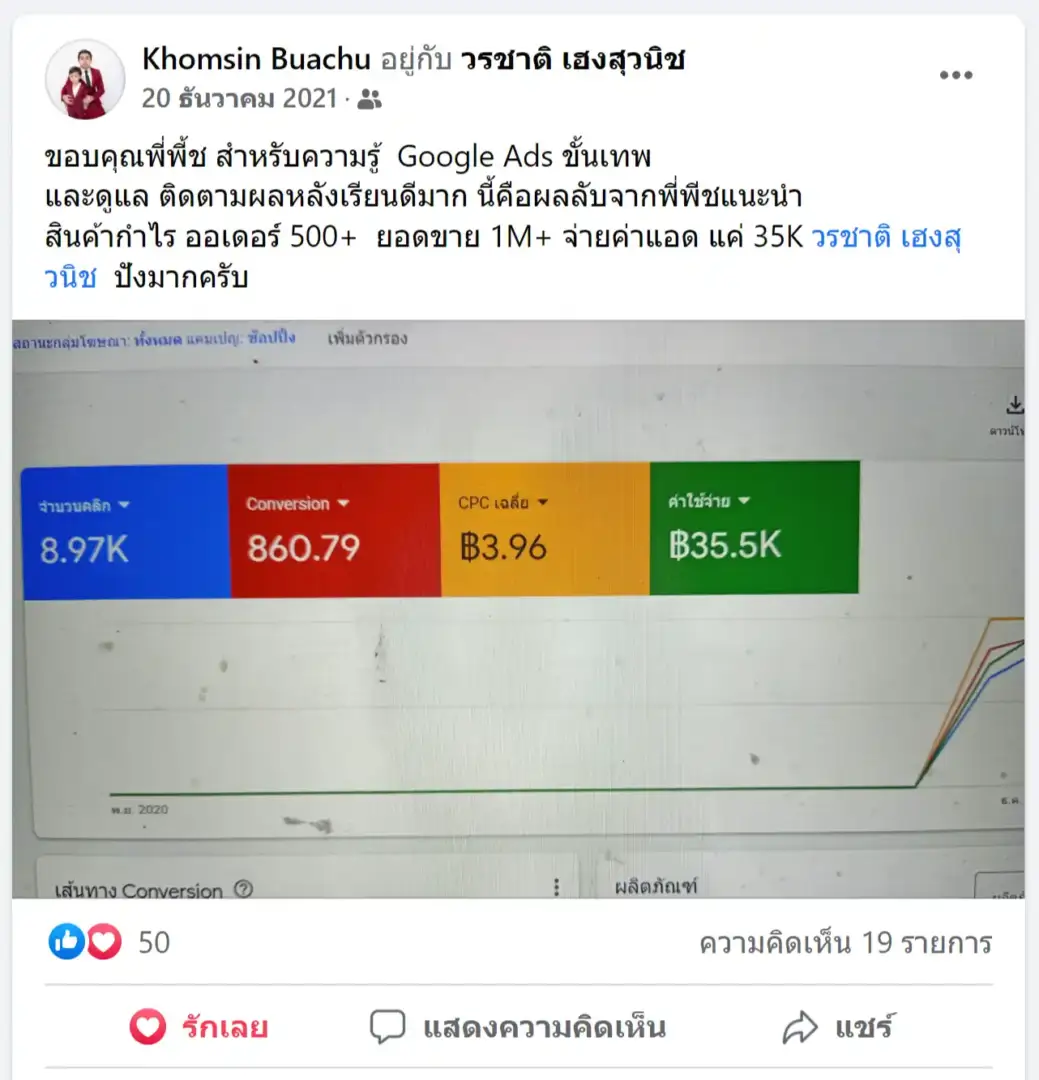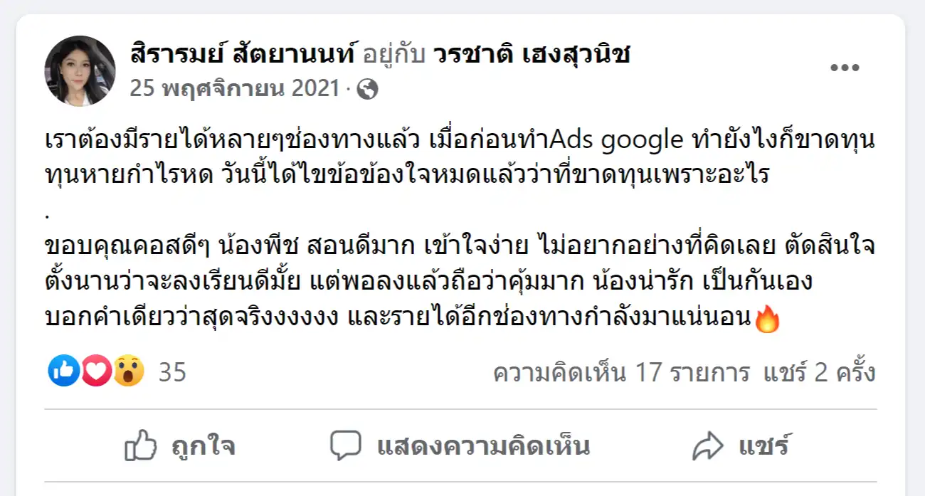 คราวนี้ไม่ใช่แค่การขายของ แต่ผมอยากสอนและถ่ายทอดประสบการณ์ให้พ่อค้าแม่ค้าออนไลน์รู้จักการยิงแอดโฆษณา หลักสูตรของผมจึงค่อย ๆ ก่อร่างสร้างตัวจากประสบการณ์จริง ใส่เทคนิค วิธีต่าง ๆ ที่เคยผ่านมาเพื่อให้การทำแอดโฆษณา เกิดผลลัพธ์อันน่าพึงพอใจ ผมอาจไม่ใช่คนที่เก่งที่สุดในด้านนี้ แต่ผมเชื่อว่าสิ่งที่ผมตั้งใจถ่ายทอดออกไปบวกกับทุกคนมีความพยายาม และเมื่อนำเอาหลักสูตรของผมไปปรับใช้ โอกาสแห่งความสำเร็จจะเกิดขึ้นอย่างแน่นอน