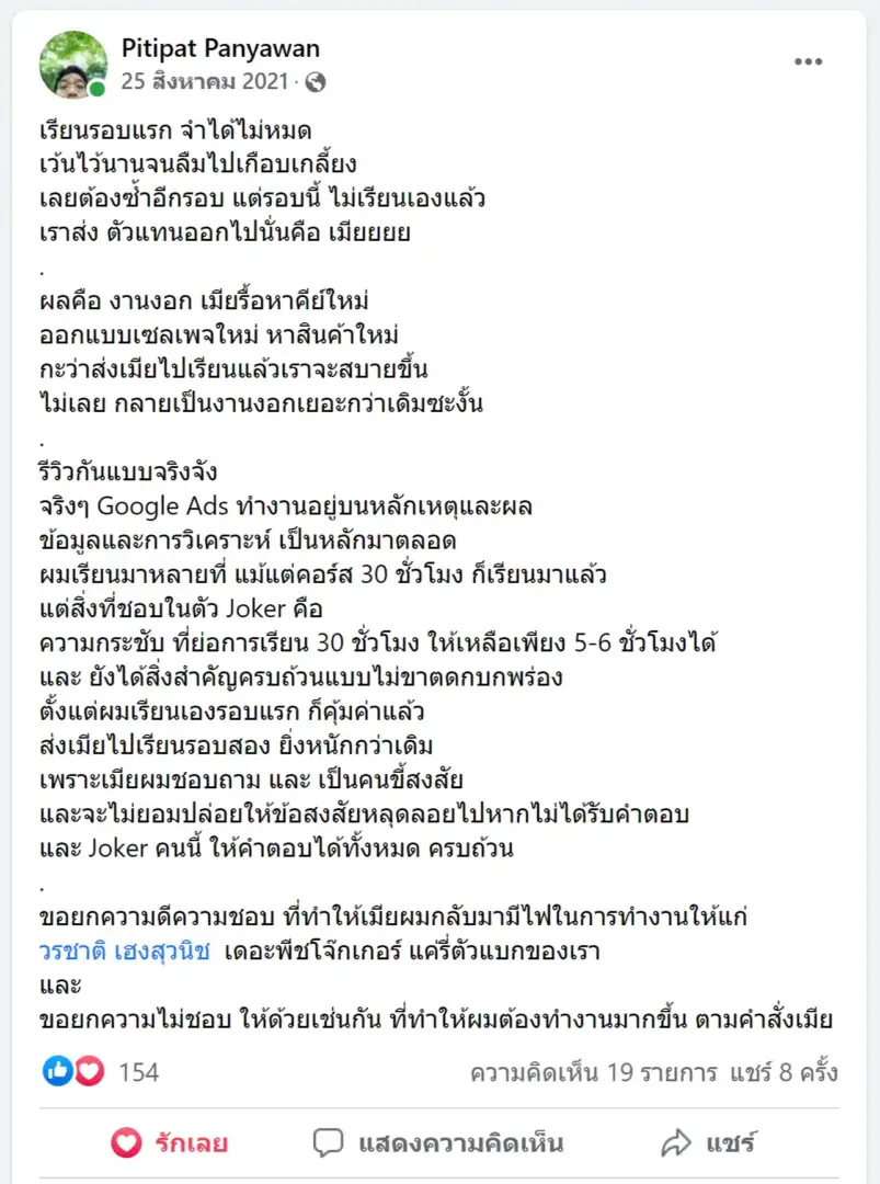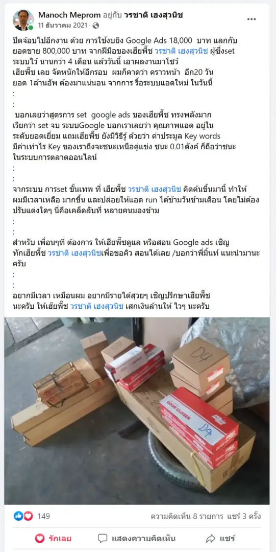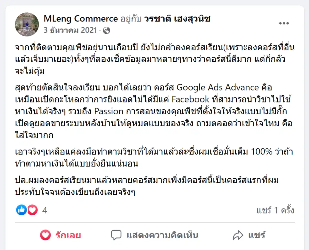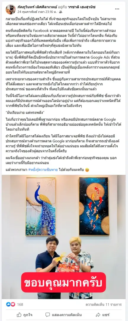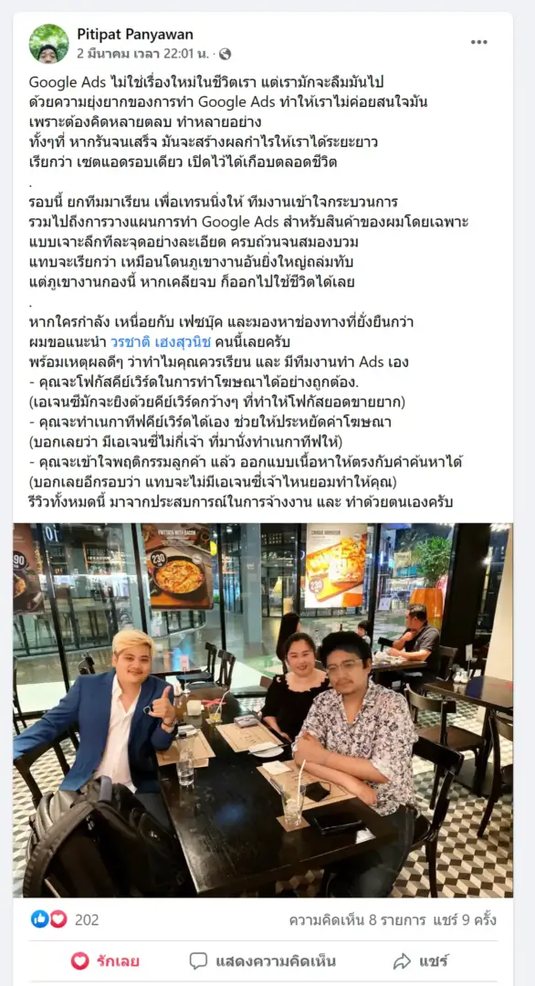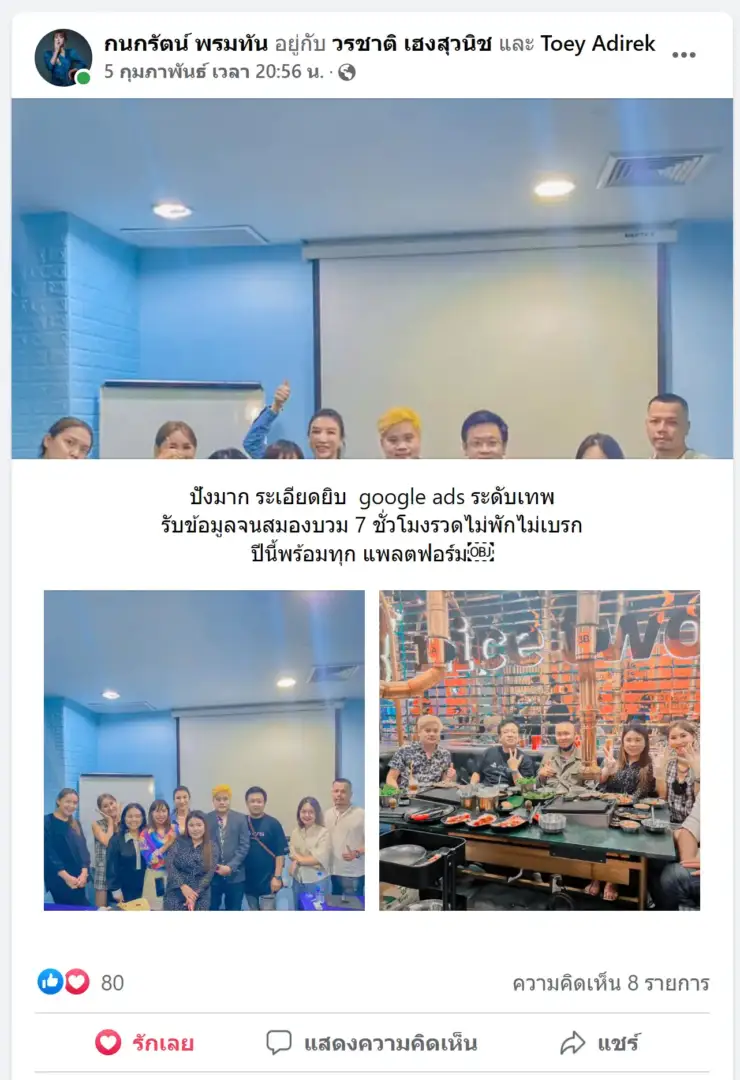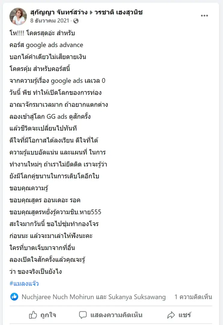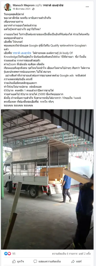 คราวนี้ไม่ใช่แค่การขายของ แต่ผมอยากสอนและถ่ายทอดประสบการณ์ให้พ่อค้าแม่ค้าออนไลน์รู้จักการยิงแอดโฆษณา หลักสูตรของผมจึงค่อย ๆ ก่อร่างสร้างตัวจากประสบการณ์จริง ใส่เทคนิค วิธีต่าง ๆ ที่เคยผ่านมาเพื่อให้การทำแอดโฆษณา เกิดผลลัพธ์อันน่าพึงพอใจ ผมอาจไม่ใช่คนที่เก่งที่สุดในด้านนี้ แต่ผมเชื่อว่าสิ่งที่ผมตั้งใจถ่ายทอดออกไปบวกกับทุกคนมีความพยายาม และเมื่อนำเอาหลักสูตรของผมไปปรับใช้ โอกาสแห่งความสำเร็จจะเกิดขึ้นอย่างแน่นอน