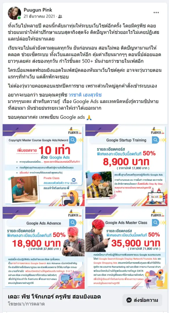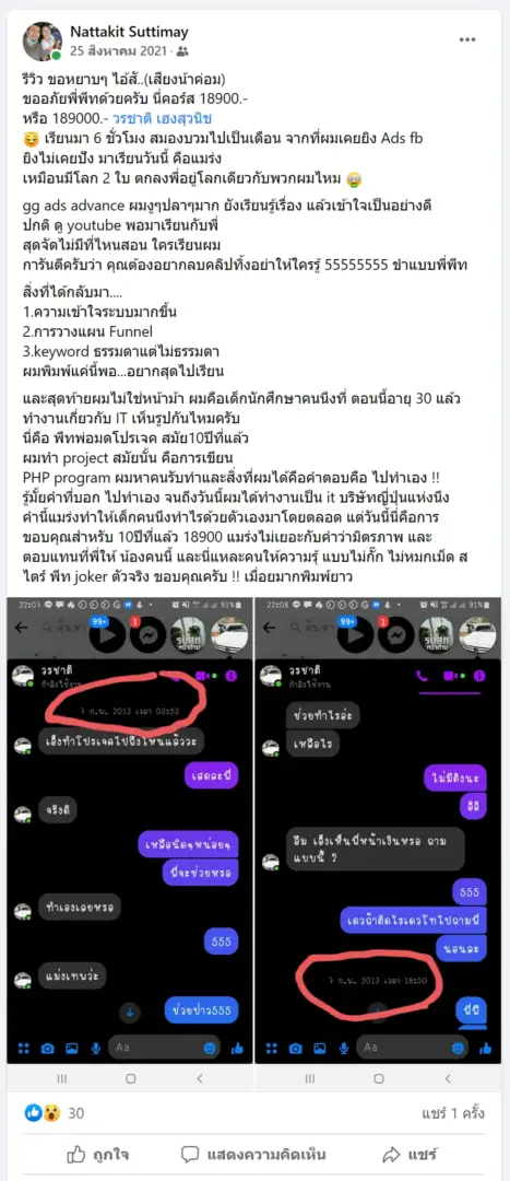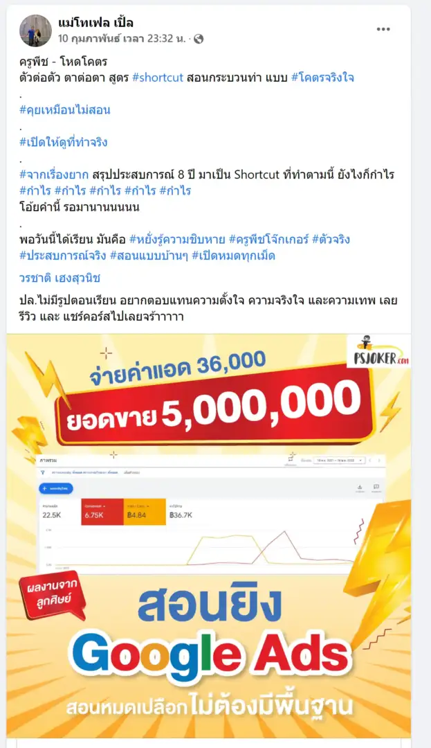 ยิงแอดเป็นเพียงแค่การกดปุ่ม แต่การที่คุณจะได้ยอดขายหรือไม่ได้ยอดขายนั้น มันอยู่ที่การวางกลยุทธ์ ทำไมค่าเรียนยิงแอดของเรา ถึงราคาแพงกว่าที่อื่น ( ในความรู้สึกของคุณ ) เพราะ สิ่งที่เราสอน มันไม่ใช่สอนแค่การกดปุ่มเท่านั้น จริงๆ หาดูวิธีการกดปุ่มได้ฟรี ใน Youtube ซะด้วยซ้ำไป แต่ที่นี่เราสอนถึงแก่น สอนถึงกลยุทธ์ สอนแบบตัวต่อตัวทุกอย่างคือความลับ ทำอย่างไรให้ได้ยอดขายที่ปัง ซึ่ง แตกต่างจากที่อื่นแน่นอน เรียนจากข้อมูลหลังบ้านจริงของแท้